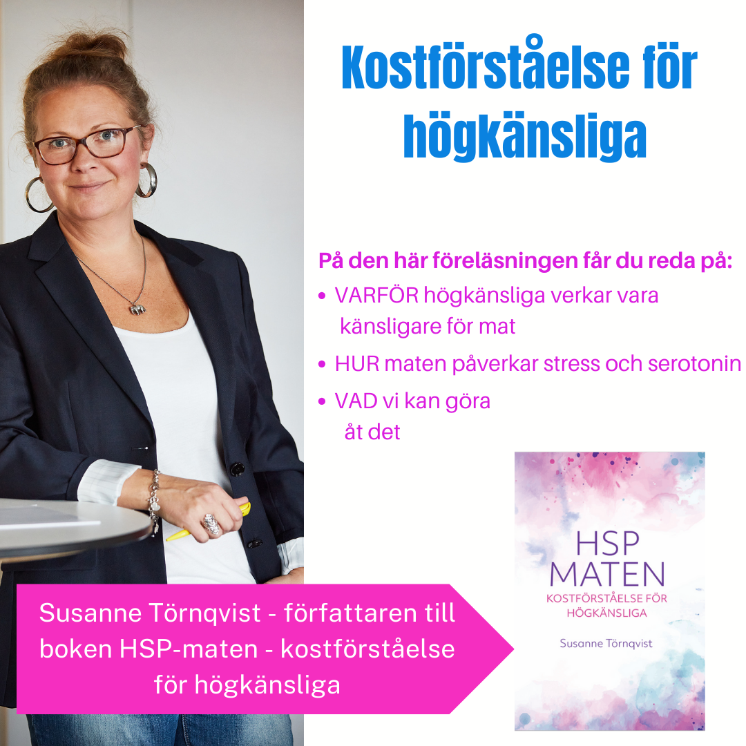 Jag heter Susanne Törnqvist, coach och författare till HSP-maten - kostförståelse för högkänsliga och flera andra böcker om kostförståelse, och grundare av utbildningen Certifierad kostcoach för högkänsliga.